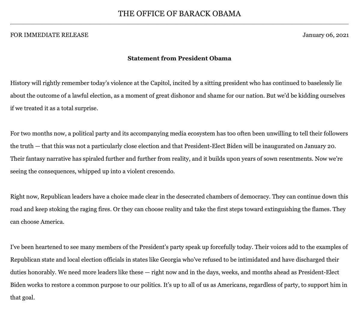6:22 p.m. Obama condemns calls Capital Hill violence: Former President Barack Obama said Wednesday’s events were “incited by a sitting president who has continued to baselessly lie about the outcome of a lawful election,” calling the takeover of the Capitol a moment of “dishonor and shame” for the nation. In a statement, the former president said he was heartened to see Republican lawmakers condemn the violence. “But we’d be kidding ourselves if we treated it as a total surprise,” he wrote.